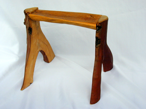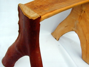 carved yew seat, arbutus legs. mortise and tenon joints. oil finish.